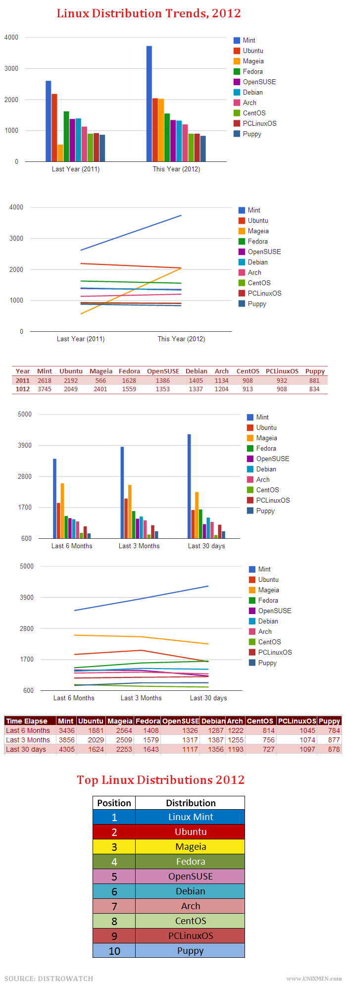 Se acerca el final del año… y con ello vamos sacando algunas estadísticas en lo que al mundo linux se refiere, si bien el firme ubuntu era el líder en solitario ahora ha dejado el trono a Linux Mint. Personalmente creo que los desarrolladores de este proyecto están haciendo un trabajo excepcional, y todo el margen de elección de escritorios deja una elección bastante amplia, estoy escribiendo estas líneas desde un Linux Mint 14 y va como la seda. Con lo que doy fe del listado.